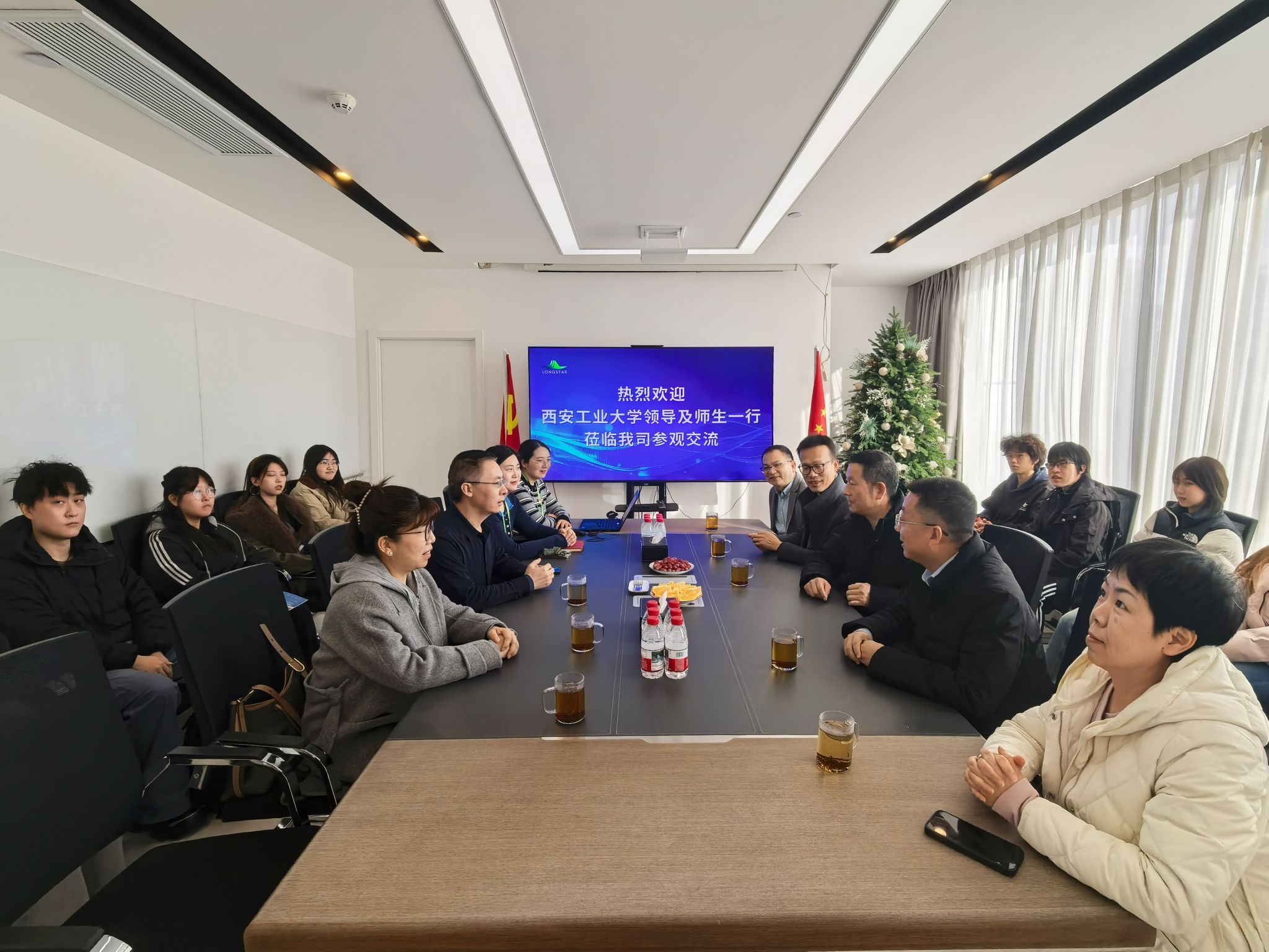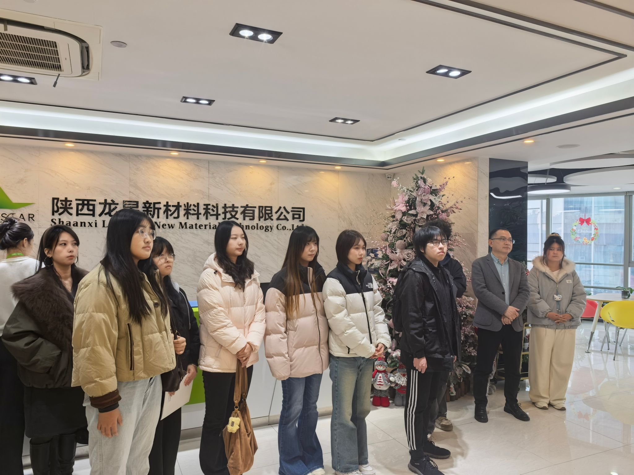 党委书记周著、学工办主任杨娜娜随行,陕西龙星新材料科技有限公司董事长王晓龙热情接待。