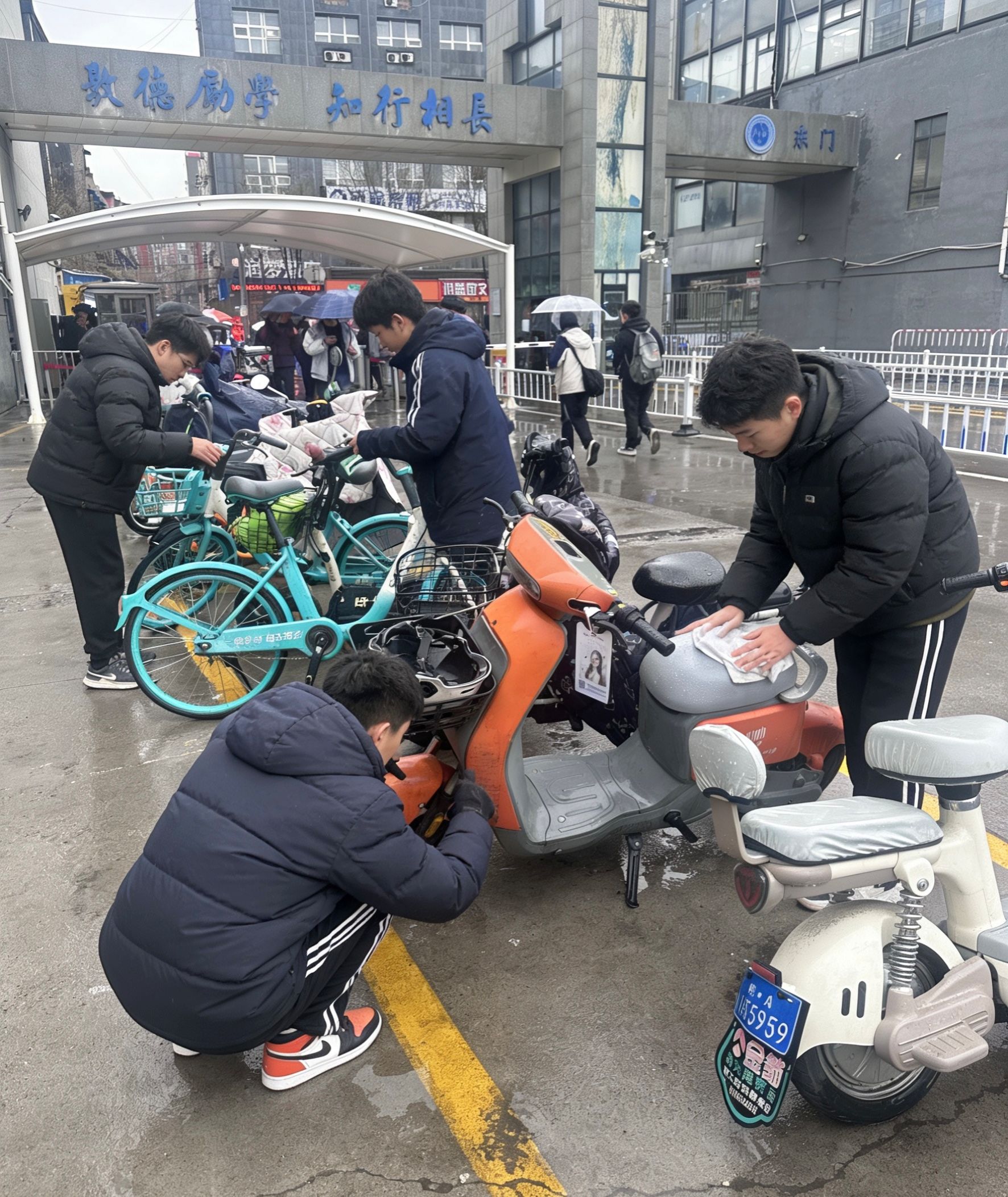 深化资助育人、引导受助学生从“受助”向“反哺”转变的实践载体,志愿者们以实际行动践行志愿初心,逐一扶起乱停放在人行道、绿化带、消防通道及宿舍门口的车辆,严格对照校园停车标线规范摆放,确保车头朝向统一、车身贴合标线,彻底清理占道车辆带来的通行隐患;针对倾倒、破损车辆细心整理归置,同步清理车辆周边杂物垃圾,全面改善校园角落环境面貌,让校园通行更顺畅、环境更整洁。大家在协作整治中锤炼责任担当,强化感恩意识与团队协作能力,用点滴行动筑牢校园安全防线,优化整体环境秩序。