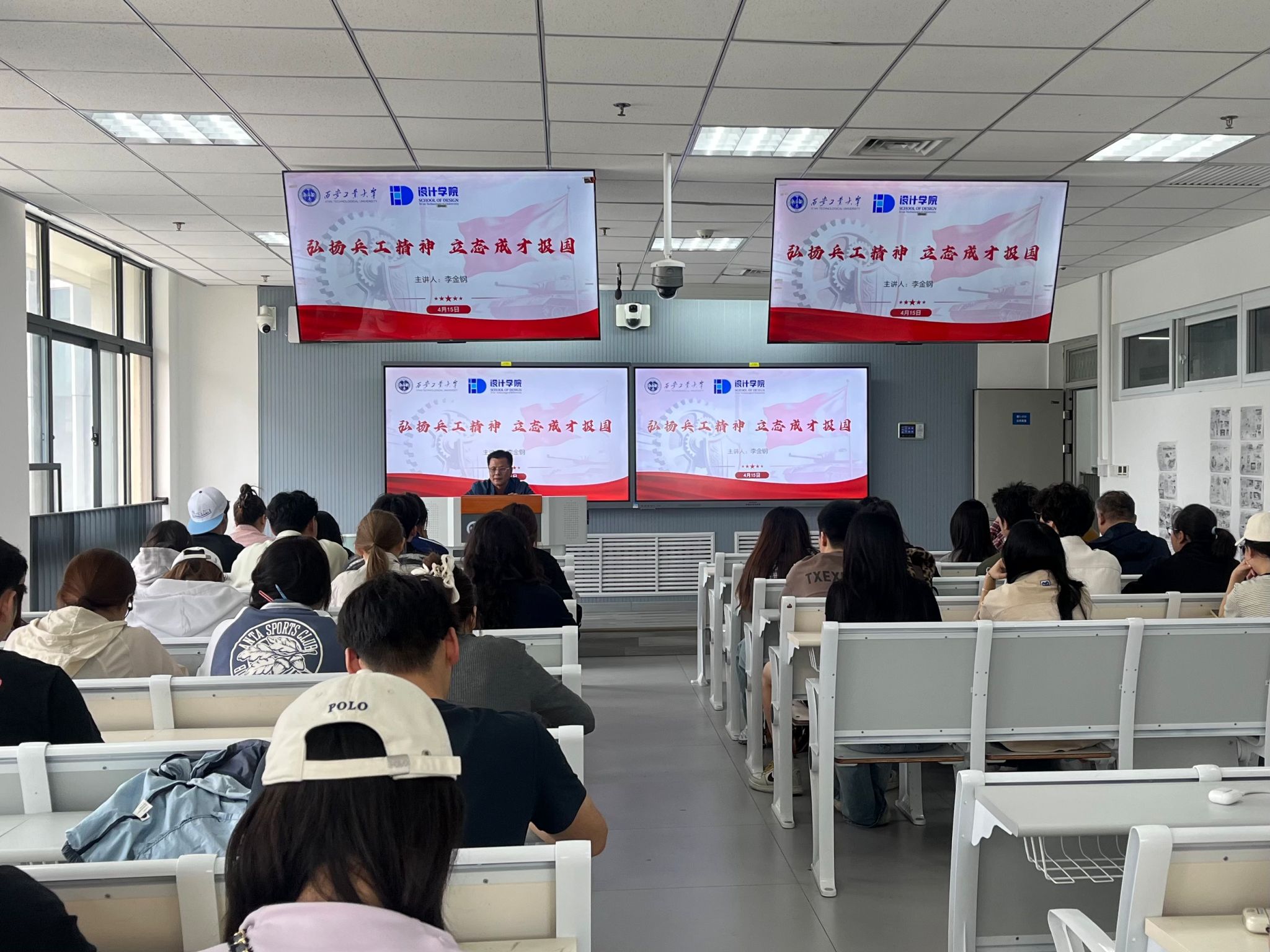 在兵工背景下的发展变迁,以及校史背后所承载的兵工基因与家国情怀。同时,就青年学生如何传承人民兵工精神。李老师结合自身经历和典型案例,引导学生将兵工精神融入专业学习和日常实践,树立正确的世界观、人生观、价值观,鼓励学生立足设计专业特色,锤炼过硬本领,把个人理想追求融入国家发展大局。最后,他叮嘱学子们要铭记兵工历史、传承兵工精神,以校史中的奋斗故事为激励,坚定理想信念,勇于担当作为。